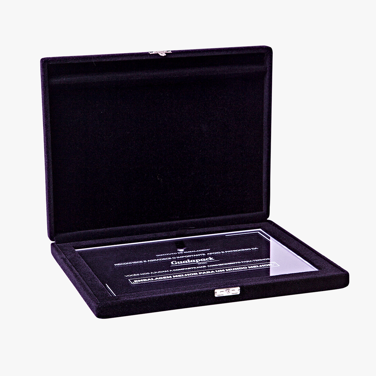 Placa de Acrílico Cristal 4mm – Impressão UV Personalizada Acondicionado em Estojo de Veludo