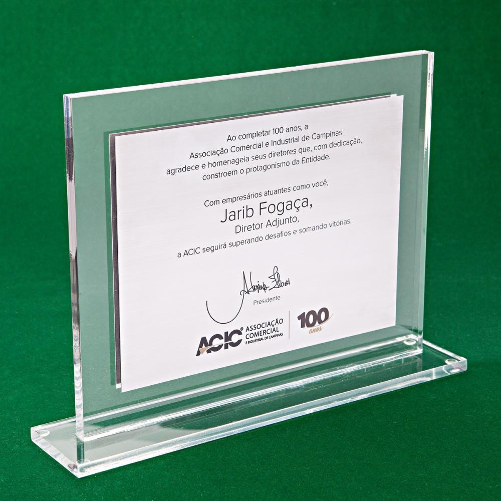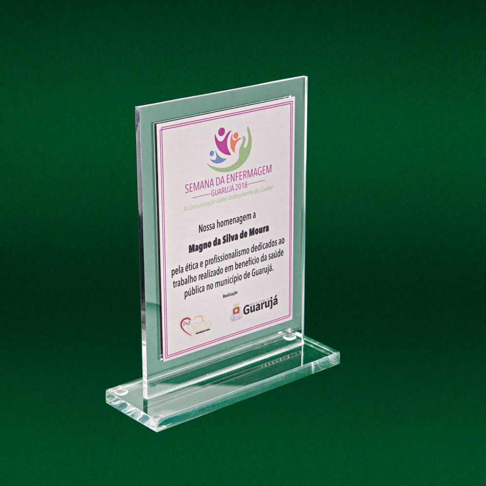 Placa de Aço Inox Escovado – Impressão (sem relevo) Corpo Cristal 4mm / Base Acrílico 6mm